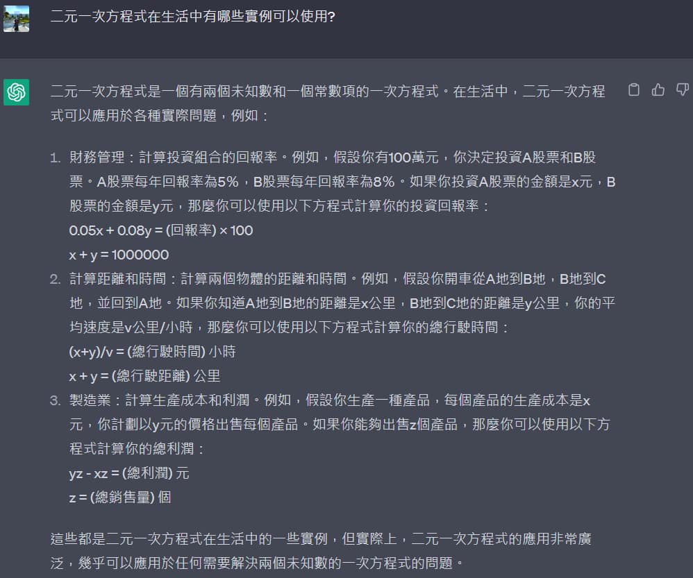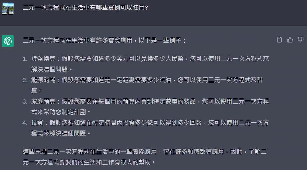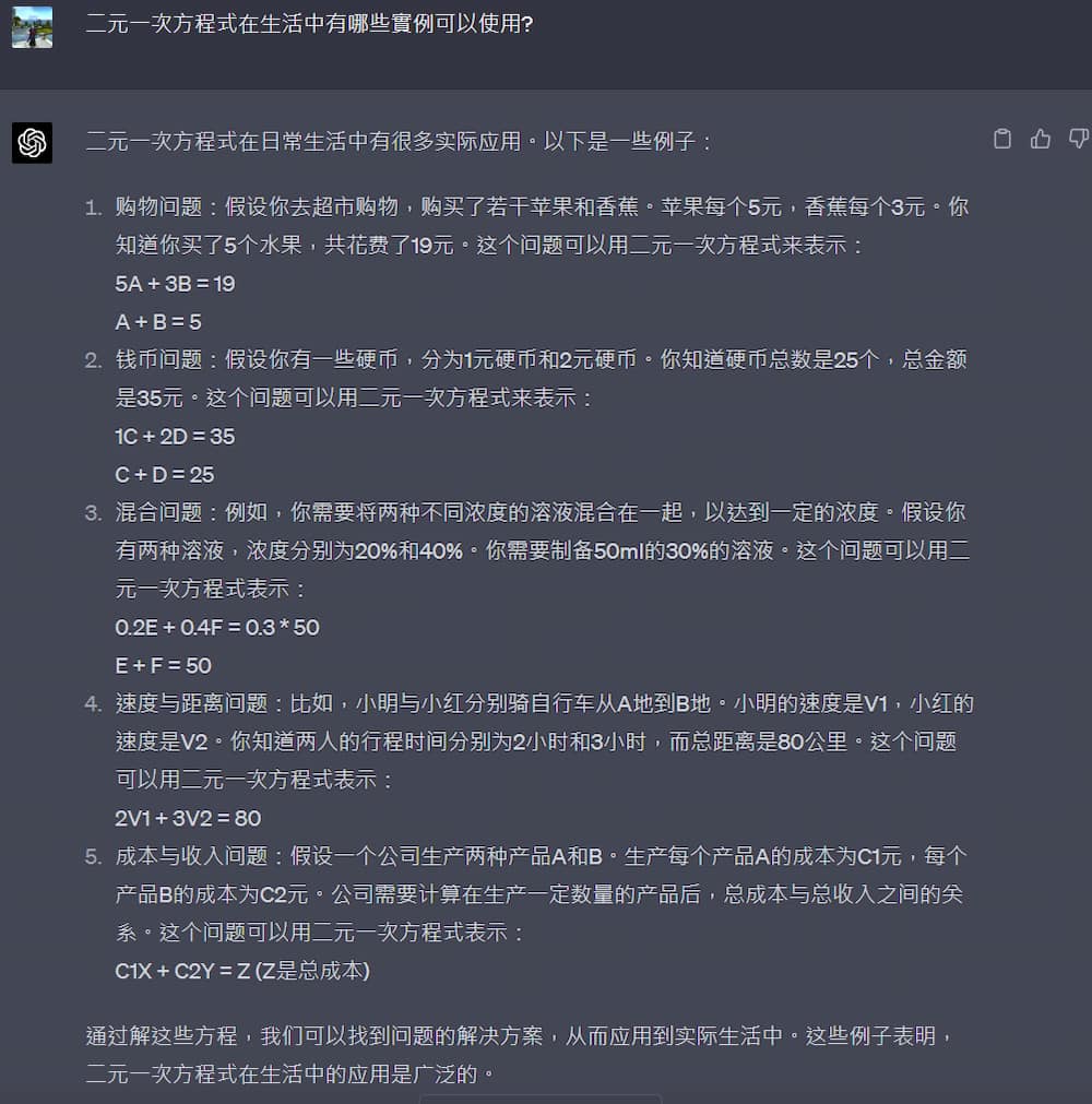 這一題是問「二元一次方程式在生活中有哪些實例可以使用?」