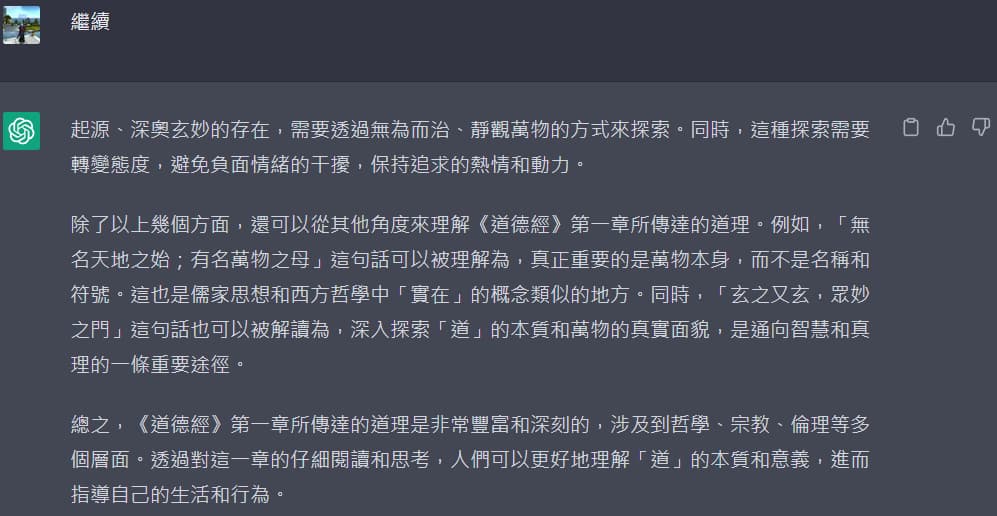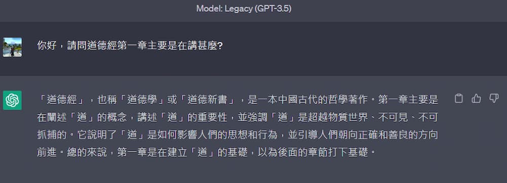有上述回答可以看出,免費版GPT-3.5回復的訊息比較少、且內容比較沒那麼深入(只有圍繞在"道"的解釋),而且比較多贅字。