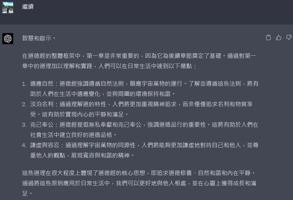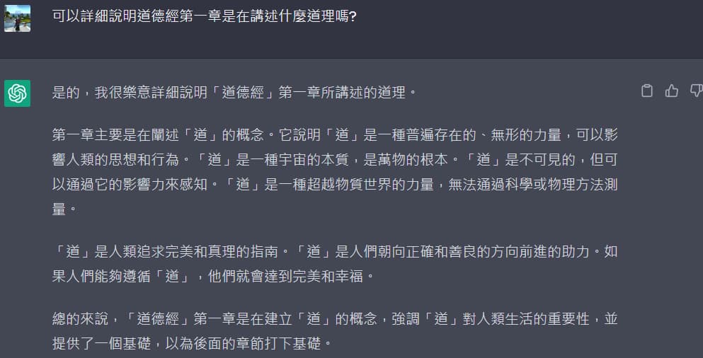 先問簡單的問題:「道德經第一章在說什麼?」以及追加提問「詳細說明」